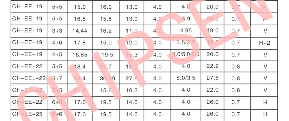 EE5/0.6W, EE8.3/2W, EE10/5W, EE12.8/7W, EE13/8-16W, EE16/10-15W, EE19/14-24W, EE22/20W, EE25/33-60W, EE28/60W, EE30/90W, EE32/95W, EE33/120W, EE34/100W, EE35/90-125W, EE40/175W,EE42/265-350W, EE55/660-800W, EE65/900-1250W, EE70/1500W